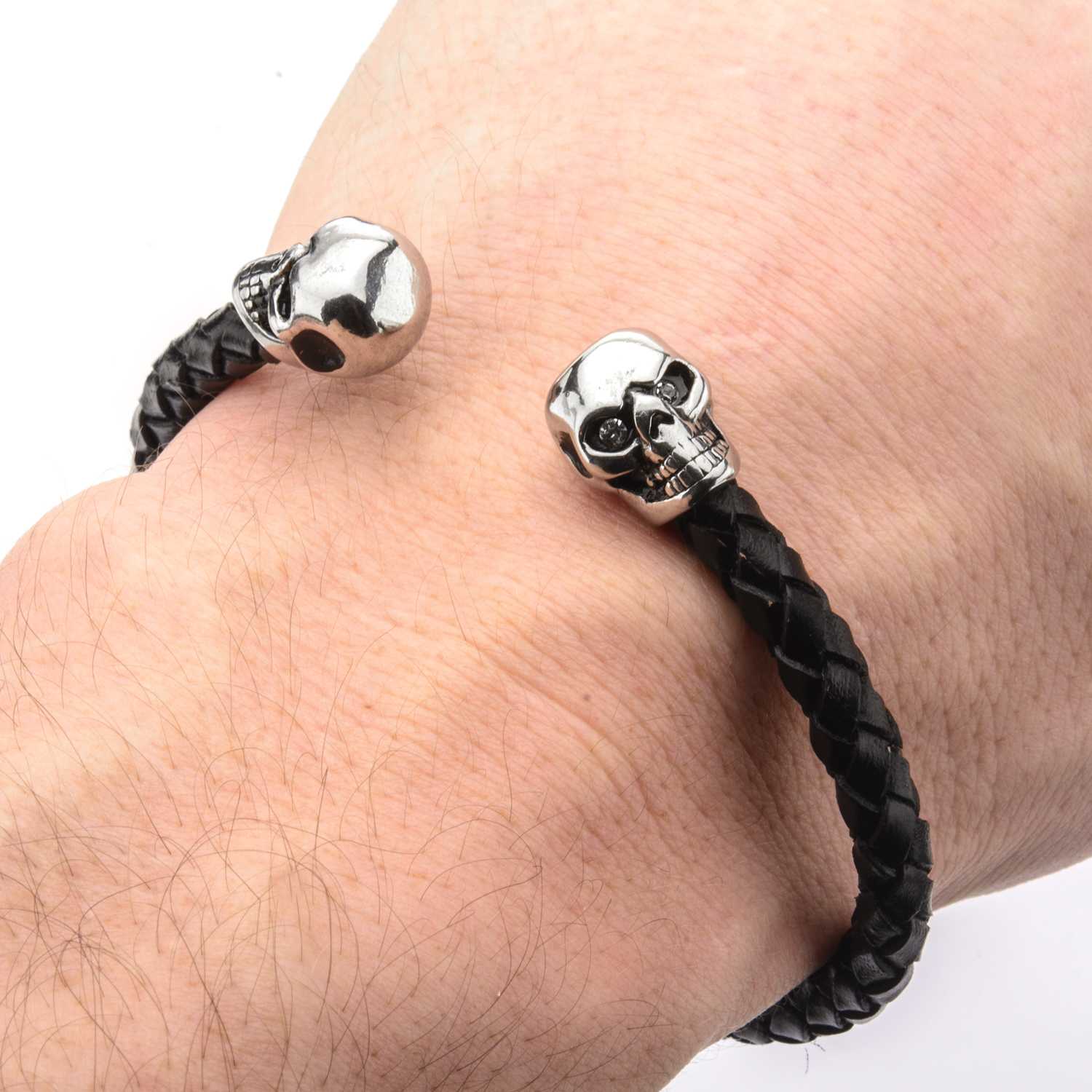 Leather bracelet for men with two stainless steel skulls, 21cm long. more