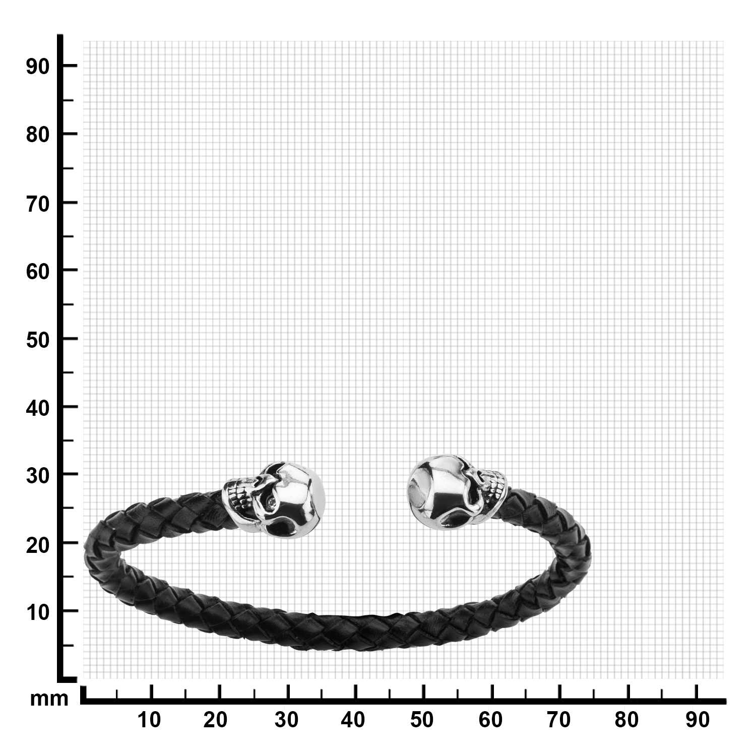 Leather bracelet for men with two stainless steel skulls, 21cm long.